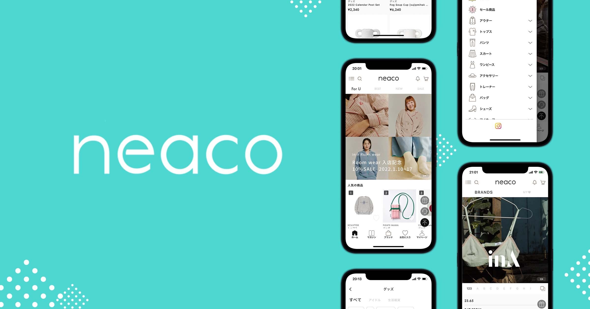 「neaco」は最新韓国ファッションブランドを購入できるレディースファッション通販サービスです。新規サービスの立ち上げにあたり、アプリ名の決定、タグラインの開発、ロゴデザイン、アプリのUX・UIデザインを担当しました。
